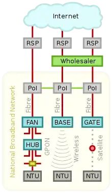 The National Broadband Network (NBN) is an Australian national wholesale open-access data network. It includes wired and radio communication components rolled out and operated by NBN Co, a government-owned corporation. Internet service providers, known under NBN as retail service providers or RSPs, contract with NBN to access the data network and sell fixed Internet access to end users.[1]