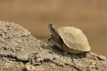 The critically endangered gharial and the red-crowned roof turtle live here, and together with the endangered Ganges river dolphin are the keystone species of the sanctuary. Other large threatened inhabitants of the sanctuary include mugger crocodile, smooth-coated otter, striped hyena and Indian wolf. Chambal supports 8 of the 26 rare turtle species found in India, including Indian narrow-headed softshell turtle, three-striped roof turtle and crowned river turtle. Other reptiles who live here are: Indian flapshell turtle, soft shell turtle, Indian roofed turtle, Indian tent turtle and monitor lizard.[4]