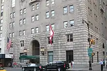 The club's foundation stone on the modern clubhouse was laid by Gladstone on 9 November 1884, when he declared "Speaking generally, I should say there could not be a less interesting occasion than the laying of the foundation-stone of a Club in London. For, after all, what are the Clubs of London? I am afraid little else than temples of luxury and ease. This, however, is a club of a very different character", and envisioned the club as a popular institution for the mass electorate.[7] However, another of the club's founders, G. W. E. Russell, noted "We certainly never foresaw the palatial pile of terra-cotta and glazed tiles which now bears that name. Our modest object was to provide a central meeting-place for Metropolitan and provincial Liberals, where all the comforts of life should be attainable at what are called 'popular prices'", but added "at the least, we meant our Club to be a place of "ease" to the Radical toiler. But Gladstone insisted that it was to be a workshop dedicated to strenuous labour."[7] Funds for the clubhouse were raised by selling 40,000 shares of £5 each (equivalent to £554 in 2021), in a Limited Liability Company, with the unusual stipulation that "No shareholder should have more than ten votes", so as to prevent a few wealthy men from dominating the club.[4] However, this only raised £70,000 (equivalent to £7,762,829 in 2021),[5] and so an additional £52,400 was raised for the construction of the clubhouse by the Liberal Central Association.[8] The remaining £30,000 necessary was raised by mortgage debentures.[5]