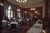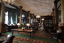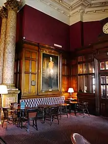 Throughout the 1960s and 1970s, all London clubs were in serious decline,[1] and the NLC was no exception. By the 1970s the club was in a serious state of disrepair, its membership dwindling, and its finances losing almost a thousand pounds a week. In 1976, Liberal leader Jeremy Thorpe handed over the club to Canadian businessman George Marks, styling himself George de Chabris (and, more improbably, "His Serene Holiness the Prince de Chabris", which he claimed was "a Catholic title"), who, unknown to Thorpe, was a shrewd operator. "De Chabris" claimed to be a multi-millionaire willing to funnel money into the club (although both his wealth and his willingness to finance the club turned out to be untrue), and he spent nine months running the club, relaxing membership rules and bringing in more income, but also moving his family in rent-free, running several businesses from its premises, paying for a sports car and his children's private school fees from the club's accounts, and he eventually left in a hurry owing the club £60,000, (equivalent to £459,427 in 2021) even emptying out the cash till of the day's takings as he went. He eventually agreed to pay back half of that sum in instalments. In his time at the club he also sold it a painting for £10,000, when it was valued at less than £1,000.[44] One of his more controversial reforms was to sell the National Liberal Club's Gladstone Library (which contained the largest library of 17th- to 20th-century political material in the country, including 35,000 books and over 30,000 pamphlets) to the University of Bristol for £40,000. The pretext given was that the club could no longer afford to pay the Librarian's wages, and that it did not want to leave such valuable material unguarded.[45] Ian Bradley described it as "a derisory sum" for the sale, particularly in light of the unique collection of accumulated candidates' manifestos from 19th-century general elections.[46] Until its sale, it had been, as Peter Harris observed, "The most extensive of the Club libraries of London."[3] The collection is still housed at Bristol today. However, the papers referring to the history of the club itself were returned to the NLC in the 1990s, as they had not been included in the sale, and had been sent to Bristol by accident.[3]