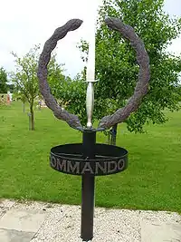 The Commandos were formed by the Army in June 1940 as a well-armed but non-regimental raider force employing unconventional and irregular tactics to assault, disrupt and reconnoitre the enemy. This memorial consists of a reproduction of part of the Association badge – the wreath in copper and the Fairbairn–Sykes fighting knife in stainless steel. It was created at Anwick Forge in Lincolnshire. | |