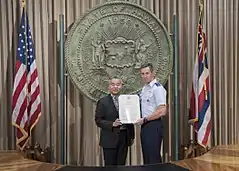 ![]() Governor David Ige presents the Proclamation for Hawaii Military Appreciation Month, to U.S. Air Force Maj. Gen. Kevin Schneider. | |