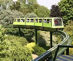 The Beaulieu Monorail is England's first monorail,[1] linking the National Motor Museum to the Beaulieu Palace House. the monorail line passes through the main museum building, allowing passengers to see the automobile collection from above. Originally installed at a Butlins Holiday Camp, the monorail was moved to its present location in 1974. The cars were originally of a streamliner design, but were modified to allow for more passenger space prior to beginning work at Beaulieu.[2] The line was formally opened 29 July 1974.[3]