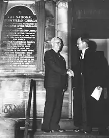 - 3. Attendance of President Harry S. Truman at the consecration of The National Presbyterian Church – On October 15, 1947, clergy throughout the denomination and the city of Washington converged at the Covenant-First Presbyterian Church for a dedicatory service to establish that church as The National Church of the Presbyterian denomination. Senior Minister Edward L. R. Elson unveiled the plaque to the President of the United States, Harry S. Truman.[32]