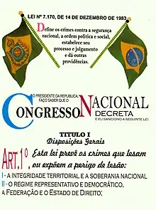The National Security Law was a Brazilian law that sought to guarantee the national security of the State against the subversion of law and order.[1][2] It was revoked in 2021 by Law No. 14,197,[3] though its provisions pertaining national security and the defense of the democratic rule of law, including crimes against national sovereignty: attacks on the nation's sovereignty, national integrity and espionage, became part of the Brazilian Penal Code.[4]