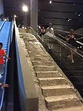 Designed by Davis Brody Bond, the museum is about 70 feet (21 m) below ground and accessible through a pavilion designed by Snøhetta.[91] The National September 11 Memorial Museum encloses 110,000 square feet (10,000 m2) of publicly accessible space.[92] The pavilion has a deconstructivist design, resembling a partially collapsed building (mirroring the attacks), and houses two "tridents" from the Twin Towers. One of the museum's walls is an exposed side of the slurry wall retaining the Hudson River, which remained intact through the September 11 attacks.[93][94] About half of what Daniel Libeskind originally wanted to preserve of the wall is visible in the museum.[95]
