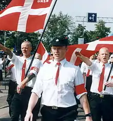 The National Socialist Movement of Denmark (Danish: Danmarks Nationalsocialistiske Bevægelse, DNSB) is a neo-Nazi political party in Denmark. The movement traces its origins back to National Socialist Workers' Party of Denmark (DNSAP, Danmarks Nationalsocialistiske Arbejderparti), the Danish Nazi party founded in the mid-1930s, more or less as a copy of Adolf Hitler's German NSDAP. After the end of the Second World War, a few people continued under the original party name, and published the newspaper Fædrelandet (The Fatherland) during the period 1952–1972. The movement was dissolved, reformed, and renamed several times between 1972 and 1991. The current incarnation of Danmarks Nationalsocialistiske Bevægelse was founded on 1 September 1991 by Jonni Hansen.