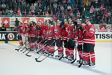 The Canadian national colours and the de facto third colour, black, are used prominently by ice hockey teams representing the nation, including the men's ice hockey team, men's junior ice hockey team, men's under-18 ice hockey team, men's ice sledge hockey team, men's inline hockey team, women's ice hockey team, and women's under-18 ice hockey team. The logo of Hockey Canada, the national governing body for ice hockey in Canada, is red, white, and black; though, their specifications are different from those of the national colours.[20]