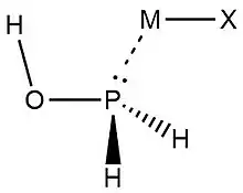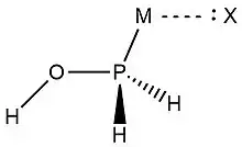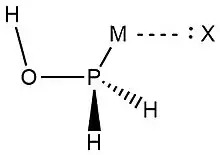 Zheng et al., also analyzed MX interactions with trans- and cis-phosphinuous acid to compare the electron donating abilities of phosphorus and oxygen atoms. The results above demonstrate that when phosphorus acts as the electron donor the weights of ωI and ωII are similar.[9] This is indicative of 3-center 4-electron bonding models. Despite greater mixing, ωII is determined to be the best natural Lewis structure for both the trans- and cis- complexes, with CuBr and AgBr as the only exceptions. Researchers explain that this result is consistent with analyses showing the preference for phosphorus to form covalent interactions. Overall, "the degree of covalency for P–M bonds decreases in the order of F> Cl > Br, Au > Cu > Ag, while the degree of noncovalent for O–M bonds, there is an increase according to F < Cl < Br, Au < Cu < Ag in the entire family."[9]