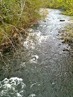 As part of the Housatonic River watershed, the Naugatuck River historically hosted the southernmost Atlantic salmon (Salmo salar) migrations.[13] Historical runs of anadromous fish also included native American shad (Alosa sapidissima, Connecticut's state fish), alewife (Alosa pseudoharengus) and blueback herring (Alosa aestivalis). Dam construction for hydropower, cooling and rinse water, and boiler water for industry began circa 1763 and continued during the industrial revolution of the 1800s. These dams, as well as wastewater from the towns that grew up around factories along the river, contributed to the extirpation of many species of fish. Over time and with the closing of many of the factories, the dams ceased to provide hydropower or serve any other economic purpose. The Anaconda Dam (Waterbury), Freight Street Dam (Waterbury), Union City Dam (Naugatuck) and the Platts Mill Dam (Naugatuck) were removed in 1999, while the Kinneytown Dam was bypassed with a fish ladder that same year. The Chase Brass Dam, between Waterbury and Thomaston, was removed in 2004.[6] A fish bypass channel, the first of its kind in New England, now permits fish to migrate past the Tingue Dam and opens an additional 32 miles (51 km) of the river to anadromous fish migration.[14] The installation of the fish bypass on the Tingue Dam in Seymour leaves only the Plume and Atwood Dam in Thomaston as the last barrier on the river to fish migration.[6]