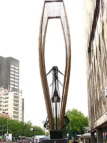 Gabo elaborated many of his ideas in the Constructivist Realistic Manifesto, which he issued with his brother, sculptor Antoine Pevsner as a handbill accompanying their 1920 open-air exhibition in Moscow. In it, he sought to move past Cubism and Futurism, renouncing what he saw as the static, decorative use of color, line, volume and solid mass in favor of a new element he called "the kinetic rhythms (…) the basic forms of our perception of real time."[6] Gabo held a utopian belief in the power of sculpture—specifically abstract, Constructivist sculpture—to express human experience and spirituality in tune with modernity, social progress, and advances in science and technology.[2][3][5] After working on a smaller scale in England during the war years (1936-1946), Gabo moved to the United States, where he received several public sculpture commissions, only some of which he completed.[1] These include Constructie, a 25-metre (82 ft) commemorative monument in front of the Bijenkorf Department Store (1954, unveiled in 1957) in Rotterdam, and Revolving Torsion, a large fountain outside St Thomas' Hospital in London. The Tate Gallery, in Millbank, London, held a major retrospective of Gabo's work in 1966 and holds many key works in its collection, as do the Museum of Modern Art and Guggenheim Museum in New York. Work by Gabo is also included at Rockefeller Center in New York City and The Governor Nelson A. Rockefeller Empire State Plaza Art Collection in Albany, New York, US.