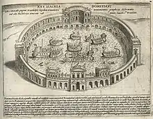 The naumachia (in Latin naumachia, from the Ancient Greek ναυμαχία/naumachía, literally "naval combat") in the Ancient Roman world referred to both the staging of naval battles as mass entertainment, and the basin or building in which this took place.