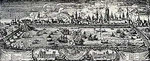 A Naumachia was staged on the Thames at the wedding of Princess Elizabeth and Frederick V of the Palatinate in February 1613.[7] In June 1613 Anne of Denmark visited Bristol. A seat was built for her at Canon's Marsh near the Bristol Cathedral, where on 7 June she watched a staged battle at the confluence of the Avon and Frome rivers, fought between an English ship and two Turkish galleys.[8] After the victory, some Turkish captives (played by actors) were presented to her and she laughed at this, saying both the actors' costumes and their "countenances" were like the Turks. The entertainment at Bristol was described in verse by Robert Naile, who mentions the Turks were played by sailors, "worthy brutes, who oft have seen their habit, form and guise". They were made to kneel before Anne of Denmark and beg for mercy as the final act of the pageant.[9]