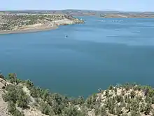 Navajo Dam is a dam on the San Juan River, a tributary of the Colorado River, in northwestern New Mexico in the United States. The 402-foot (123 m) high earthen dam is situated in the foothills of the San Juan Mountains about 44 miles (71 km) upstream and east of Farmington, New Mexico.[3] It was built by the U.S. Bureau of Reclamation (Reclamation) in the 1960s to provide flood control, irrigation, domestic and industrial water supply, and storage for droughts. A small hydroelectric power plant was added in the 1980s.