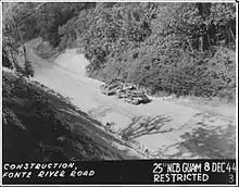On 21 July 1944, 621 men and 23 Officers landed under fire on Guam, with the 3rd Marine Division.[1][4][5] The Division had three shore parties one for each regiment. 25 NCB had I Co. posted to the 3rd Marine Regiment, G Co. to the 9th Marines and H Co. to the 21st Marines. Each shore party was made up of one Pioneer Company and one Seabee company.[1] Commander Whelan was Shore party Commander for the 3rd marine Regiment on Beaches Red 1 and Red 2. During the assault phase the entire 19th Marines were assigned to combat teams.[6] The 25th's Lt.Cmdr. Whelan was shore party commander for the 3rd Marine Regiment on beaches Red 1 and Red 2.[7] He received the bronze star for his leadership of the shore party as did Lt Cdr. Brett W. Walker for the same reason on beaches Blue and Green. The jungle conditions were such that bulldozers were required for everything. Roads had to be grubbed to get supplies to the front, the wounded evacuated, and the artillery em-placed. There were numerous times the Seabees were working in front of the lines in order for the lines to advance and lost men doing that. Dozers were needed so badly that those organic to the artillery units had to be reassigned until they were not required. The Seabees brought with an organic element the Marines did not have i.e. bulldozers with winches and D8s 132–148 Hp compared to the Marine's TD 18s 72–80 Hp. Afterwards the Marines assessment was that: "in all future amphibious operations a Seabee component or one with equal road building capabilities be assigned to the assault". It was not until 20 September that that entire Battalion was completely on Guam. One of the Battalions projects was Harmon Airfield.
