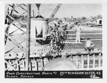 On 17 August, the battalion returned to the Navy administration and assigned to the 27th NCR of the 5th Construction Brigade.[9][1] Another former USMC CB, the 53rd was assigned to the 27th NCR as was the 2nd Separate Marine Engineer Battalion.[10] The 25th was decommissioned in November 1945 with the 133rd NCB taking over its work orders on Guam.[11]