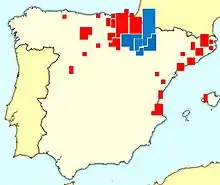 - ↑ Cerro 1988, pp. 105, later the area tended to split; the North voting Carlist and the South against them, see Fuente 1990, p. 956, for 1930s see Serrano 1989, pp. 767-770 tables and maps 771-772
