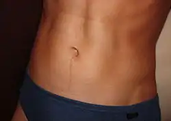 Some navel fetishists can be aroused by viewing a navel.[42] In the case of a heterosexual man, a woman in bikini or low-rise clothing like jeans, shorts, etc., that reveals the navel is also considered sexually arousing.[43] Indian journalist Bachi Karkaria once commented, "The navel is an erogenous zone. This is the reason why its exposure is always in fashion. Women have flashed it through the ages because men are turned on by it. It is shown because it wants to be seen".[44]