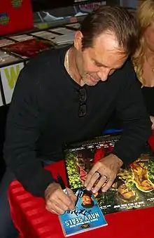 Star Michael Biehn signing a copy of the DVD cover during an August 2012 appearance at Midtown Comics in Manhattan.