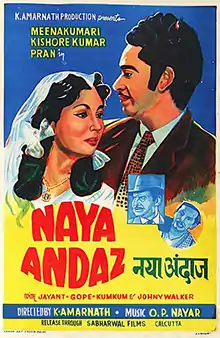 Naya Andaz (transl.The new style) is a 1956 Indian Hindi-language film starring Kishore Kumar and Meena Kumari in lead roles. The music was composed by O. P. Nayyar.