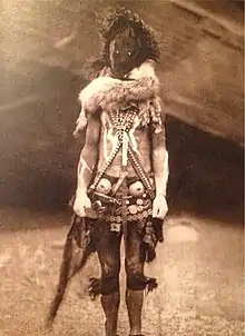 Changing Woman (sometimes The White-Painted Woman or The White Shell Woman) became pregnant with her children after basking in the Sun God's rays while bathing in a pool of water.[4] The giant Yéʼiitsoh heard when the children were born and set out to kill and devour them. Changing Woman hid her sons and tried to convince Yéʼiitsoh that it was mistaken. When questioned about the small footprints in the snow, Changing Woman replied saying that in her loneliness she made the footprints herself to pretend she has company.[5]
