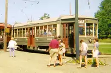 The Nearside (or Near-side) Car was a streetcar (trolley car or tram) designed by in-house engineers of the Thomas E. Mitten management team, which ran the Philadelphia Rapid Transit Company (PRT).[1] Nearside refers to the fact the car would pick up and discharge passengers on the “nearside” of an intersection rather than the “farside” as the previous generation of “conventional” cars did (this method of operation caused frequent gridlock, as the stopped cars blocked cross traffic). The 1,500 cars that the PRT ordered from the J. G. Brill Company in South Philadelphia was the largest single order of streetcars in North American history.[2] The cars were initially designed as “muzzle loaders” with only double front doors for passenger entry and exit. Later, most of the fleet would have center exit doors cut into them making them Peter Witt cars. The cars were in service in Philadelphia from 1911 to 1955, when they were scrapped in favor of the more modern PCC streetcar. Nearside cars were also purchased by the International Railway Company of Buffalo, NY[3] and in Chicago by the Chicago Surface Lines, both properties were also managed by Mitten.[4]