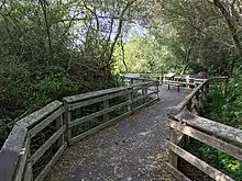 The park features approximately 1 mile (1.6 km) of wheelchair accessible gravel trails that encircle the lagoon, as well as a 1,076 ft (328 m) long floating boardwalk and pier that passes through the center of the lagoon. Informational signs and benches can be found along the trails and boardwalk. A single-stall public restroom can be found at the Bay Street entrance to the lagoon.[1]