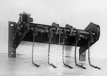 Each pull of the control wire rotated the camshaft one fifth of a turn, releasing a smoke grenade, the pin of which was drawn out by a fixed chain, and the ratchet was returned to its original position by a second spring. Five pulls on the control wire would release all five smoke grenades in succession, enabling the vehicle to reverse out of sight into its own smoke screen[2] with the grenades discharging smoke for about 100 to 200 seconds.[3] Later examples of the Nebelkerzenabwurfvorrichtung were fully enclosed in an armored box (N.K.A.V. mit Schutzmantel).[4] The Nebelkerzenabwurfvorrichtung was discontinued beginning in April 1942 because it had not proven to be effective,[3] the main disadvantage being that the resulting smoke screen built up behind the vehicle.[5] It was succeeded by the turret mounted Nebelwurfgerät launcher.