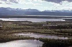 The Nabesna River, swift-flowing in its upper reaches, passes through a deep valley that opens into broad plain. Gradually slowing, the river enters the Tetlin National Wildlife Refuge, a region of marshes, hills, lakes, and forests of spruce and birch.[4]