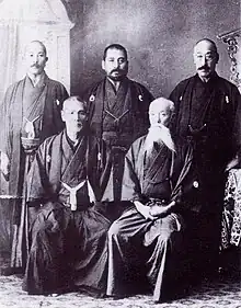 Dai Nippon Teikoku Kendo Kata committee. Negishi Shingorō (1844 - 1913) is sitting in the front right with Tsuji Shinpei (Shingyoto Ryu) next to him. In the back right to left: Takano Sasaburo (Itto Ryu), Monna Tadashi (Hokushin Itto Ryu) and Naito Takaharu (Hokushin Itto Ryu). The photo is from 1912.[1]