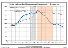 Development of Population since 1875 within the Current Boundaries (Blue Line: Population; Dotted Line: Comparison to Population Development of Brandenburg state; Grey Background: Time of Nazi rule; Red Background: Time of Communist rule)