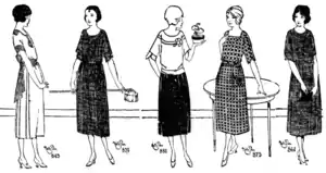 Nell had always insisted on looking nicely dressed all the time, even whilst working at home, for which many women wore cheaply made, unflattering 69-cent dresses.[1][2] The New York Times reported that she said she wanted to "make women look pretty when they are washing dishes."[3] Nell's ruffled dresses and aprons in good-quality, hard-wearing fabrics were made for herself and her family, but were admired by her friends and neighbours, who asked if she would make dresses for them too.[1] In 1916 she started working commercially, selling her first designs through a large local department store, the Gregory B. Peck Dry Goods Company in Kansas City, Missouri.[2] The original order of 216 dresses, run up by two neighbors in the Donnelly's attic on newly purchased used sewing machines, rapidly sold out.[1] This was despite the fact that at a dollar each, they were more expensive than the average housedresses.[2]