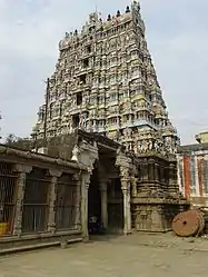 The temple complex covers an area of 14.5 acres (5.9 ha), measuring 850 feet long and 756 feet wide, and all its shrines are enclosed with concentric rectangular walls, with a massive Rajagopuram.[6] Sangili Mandapam built on 1647 by vadamalaiyappa pillayan connects the Ganthimathi Amman and Nellaiyappar temples.[7] The temple has a number of shrines, with those of Swamy Nellaiappar and his consort Sri Kanthimathi Ambal being the most prominent.