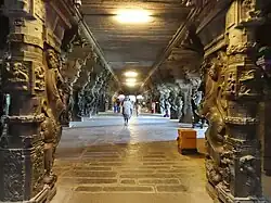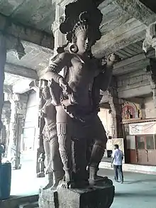 The composite columns of Virabhadra holding sword and horn are found be additions of the Vijayanayagara kings during the early 1500s. Similar columns of Virabhadra are found in Adikesava Perumal Temple at Thiruvattaru, Meenakshi Temple at Madurai, Kasi Viswanathar temple at Tenkasi, Krishnapuram Venkatachalapathy temple, Ramanathaswamy Temple at Rameswaram, Soundararajaperumal temple at Thadikombu, Srivilliputhur Andal temple, Srivaikuntanathan Permual temple at Srivaikuntam, Avudayarkovil, Vaishnava Nambi and Thirukurungudivalli Nachiar temple at Thirukkurungudi.[9]