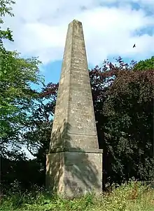 Carved onto the face of the obelisk are two Ordnance Survey bench marks, and on the south side is Ordnance Survey flush bracket number 1973. Maps indicate the height of the flush bracket as 117 metres above sea level. The stonemason's name is carved on the top of the plinth on the north side.