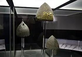 The most closely related object to the Nemiya Helmet was discovered in Romania during the construction works of the Pașcani hydropower project on the Siret river in 2010. This helmet is comparable structurally and geographically; it also contains a similar stylized human mask and ornamentation along the lower edge but it was made of several riveted parts (the lost artefact was recovered in 2021).[13]