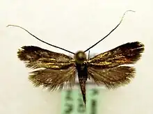 The wingspan is 12–16 millimetres (0.47–0.63 in).Head ferruginous, forehead in male black. Antennae in male with basal l/8 clothed with rough scales above, in female gradually thickened towards base. Forewings shining golden - bronze, usually more coppery posteriorly ; sometimes a faintly indicated darker postmedian fascia. Hindwings dark purplish-fuscous.[2]