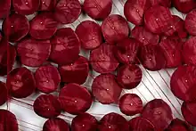 Humphrey’s Loculus series continued the artist’s interest in the body and scientific research through meditative repetition. The Loculus works involve masses of hand-stitched red discs affixed to the wall or standing structures by trails of thread. As Ken Johnson noted in The New York Times in 2001, the works have a biological appearance: their “…hand sewn red discs clustered like rose petals or blood corpuscles…”[12] Works from Humphrey's Loculus series were included in Site and Insight, curated by Agnes Gund at MoMA PS1 in 2003.[13]