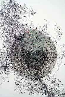 Since 2005, Humphrey has been an artist in residence at the LeDoux Neuroscience Laboratory at New York University, where she collaborates with Dr. Joseph LeDoux and his team.[14] Humphrey “wanted to find ways of not only asking questions about our emotions and how the brain processes those emotions but to visualize and conceptually explore that information in the work.”[15] With a focus on the neuroscience of emotions and the amygdala, Humphrey’s research at the lab has resulted in drawings, videos, and audio recordings that often culminate in installations and performances.[16] These works include drawings creating using a microscope equipped with a camera lucida,[17] sound recordings of neural activity, and the artist's own MRIs.[18]