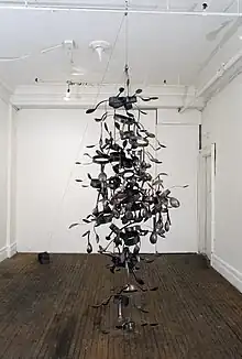 They include spoons made by hand from cut and hammered copper that are strung up in elaborate hanging sculptures resembling mobiles or chains.[7] Collaborating with the artist’s mother to make Mother’s Spoons, Humphrey would shape spoons in celluclay then pass them along to her mother to alter with wire. The resulting lines mimic the movements of hands doing domestic tasks like stirring, folding, or nursing.[8]