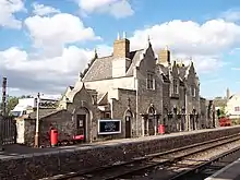 Wansford is the headquarters of the railway and most of the facilities are based here. The current station building was opened in 1995 and contains a ticket office, shop, cafe and toilets. The locomotive sheds are located at this station. Also at the station there is a miniature railway, picnic area and children's playground.[1] The station was formerly the junction for a branch to Stamford, which diverged to the north just east of the river bridge at Wansford. The original Wansford station is located on platform three and was built in 1844–1845 in Jacobean style for the opening of the railway. This building was purchased by the railway in 2015.