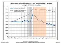 Development of population since 1875 within the current boundaries (Blue line: Population; Dotted line: Comparison to population development of Brandenburg state; Grey background: Time of Nazi rule; Red background: Time of communist rule)