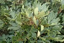 Neopanax colensoi, commonly known as mountain five finger, is a species of evergreen plant.[3] This species is native to New Zealand. An example occurrence in central Westland podocarp/broadleaf forests includes flora associates such as Cyathea smithii and Dicksonia squarrosa, Rumohra adiantiformis, Ascarina lucida, Pseudowintera colorata and Blechnum discolor.[4] The maximum height of this plant is 5 meters and it is the preferred food of possums.[5]