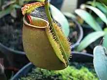 Although most parts of the plant are very large, the pitchers themselves do not rival those of species such as N. rajah. Nevertheless, they may have a volume of over one litre and grow up to 25 cm high and 16 cm wide. A pair of prominent fringed wings (≤15 mm wide) runs down the front of lower pitchers. These are usually reduced to ribs in aerial pitchers. The peristome (≤20 mm wide) is characteristically flattened and curved inwards.[11] The inner portion of the peristome accounts for around 70% of its total cross-sectional surface length.[15] It bears small but distinct teeth. The two sharp spines for which the species is famous are present on the underside of the pitcher lid, and may be 3 cm long. They are derived from the uppermost 10–12 peristome ribs.[16] The pitcher lid or operculum is reniform to cordate and has no appendages. An unbranched spur (≤15 mm long) is inserted at the base of the lid.[11]
