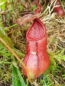 In open areas, N. bokorensis is sometimes sympatric with other carnivorous plants, including sundews and bladderworts.[11] The N. bokorensis plants found by François Mey in 2007 grew alongside a crimson form of Drosera peltata, but this population was destroyed by the time of the author's return in 2009.[12] Drosera peltata still grows sympatrically with N. bokorensis at "Location C", a massive clearing discovered in 2011 on the Bokor plateau.[11] The D. peltata plants at this site range in colour from yellowish-green to red and frequently exceed 30 cm in height.[11] Nepenthes bokorensis also shares this habitat with another sundew—D. burmannii—as well as with various grasses, stunded shrubs, and lithophytic orchids.[11] Local bladderwort species include U. bifida, U. odorata, U. minutissima, U. striatula, U. subulata, and U. uliginosa.[13][14][15][16]