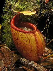 Rosette and lower pitchers are wholly ovate to urceolate. They grow up to 20 cm high by 7 cm wide. A pair of wings up to 12 mm wide runs down the ventral surface of the pitcher cup. These wings bear filiform fringe elements up to 10 mm long. The pitcher mouth is oval to circular and up to 6 cm across. It has an oblique insertion and rises at the rear to form a conspicuous neck. The peristome is cylindrical to slightly flattened and up to 2 cm wide for most of its length, becoming broader towards the neck (≤3 cm wide). It bears ribs up to 2 mm high and spaced up to 2 mm apart, which terminate in teeth (≤4 mm long) on the peristome's inner margin. The digestive zone usually covers the entirety of the pitcher's inner surface. The pitcher lid or operculum is elliptic and measures up to 6 cm in length by 4.5 cm in width. It lacks appendages or a keel. A spur is inserted near the base of the lid. It measures up to 9 mm in length, with a basal diameter of up to 2 mm, although it may be much smaller.[2]