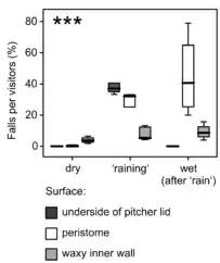- Bonhomme V., Pelloux-Prayer H., Jousselin E., Forterre Y., Labat J.-J., Gaume L. (2011). "Slippery or sticky? Functional diversity in the trapping strategy of Nepenthes carnivorous plants". New Phytologist. 191 (2): 545–554. doi:10.1111/j.1469-8137.2011.03696.x. PMID 21434933.