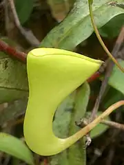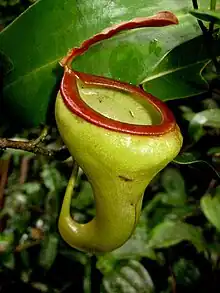 The unusual upper pitchers of N. inermis are larger than its lower pitchers, growing to 9 centimetres (3.5 in) in height and 5 centimetres (2 in) in width.[2] They gradually or abruptly arise from the ends of the tendrils, forming a 1–2 centimetres (0.4–0.8 in) wide curve.[2] They are tubular to infundibular in the lower two-thirds with laterally appressed pitcher walls. As in N. dubia, there is almost no gap between the walls in mature pitchers. The upper part of the pitcher is widely infundibular throughout. Wings are reduced to ribs in upper pitchers. The mouth is round and either horizontal or slightly raised at the front and rear. The inner surface of the pitcher is often said to be glandular throughout with no waxy zone,[9][10] but one source states that the waxy zone is merely reduced.[11] Mature upper pitchers are generally considered to completely lack a peristome, a trait that is unique to this species,[7][10] although one source gives a peristome width of 0.7 millimetres (0.03 in) for an 8 centimetres (3 in) tall upper pitcher (the inner portion of the peristome is said to account for 20% of its total cross-sectional surface length, the lowest proportion among studied species).[11] The lid is very long, narrow, and cuneiform. It is never reflexed beyond 90 degrees relative to the mouth.[7]