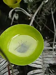 Nepenthes inermis produces extremely thick mucilaginous pitcher liquid. It is so viscous that if a pitcher is held upside down, the fluid will pour out, forming an unbroken stream several metres in length.[13][14] This fluid coats the entire inner surfaces of the pitchers in a thin film. The pitchers of N. inermis function not only as pitfall traps but also as flypaper traps, with the sticky inner walls trapping flying insects above the surface of the fluid.[7][15] The fluid also acts as a lubricant, allowing prey items to easily slide down into the bottom of the pitcher cup.[7]