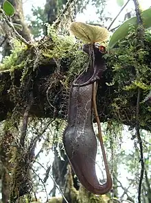 Rosette and lower pitchers are typically ovate in the basal quarter to half of the pitcher cup, becoming cylindrical and sometimes slightly infundibular above. A conspicuous hip often delimits these two parts of the trap. Terrestrial pitchers may be quite large, reaching 30 cm in height by 6 cm in width. A pair of fringed wings (≤6 mm wide) runs down the ventral surface of the trap, bearing filaments up to 12 mm long. The peristome is cylindrical at the front and becomes flattened and broader towards the sides and rear, measuring up to 3 cm in width. It bears ribs up to 2 mm high and spaced up to 2.5 mm apart. These ribs terminate in teeth (≤8 mm long) on the inner margin of the peristome, the largest being located towards the top. There is often a gap of several millimetres separating the two lobes of the peristome directly below the lid. The pitcher lid or operculum is ovate to orbicular and typically has a cordate base as well as a frilled margin. It measures up to 6 cm in length by 4.5 cm in width. A triangular or hook-shaped basal crest (≤1 cm long) is commonly present on the lower surface of the lid. An unbranched spur measuring up to 10 mm in length is inserted near the base of the lid. Lower pitchers typically have a very dark pigmentation, being purplish-black throughout. However, the indumentum covering the traps can give them an orange or brownish sheen. The peristome is generally purple, black, or dark brown, but may have lighter coloured teeth ranging from green, through yellow, to white. The inner surface of the pitcher may be light yellow, white, or light purple, and often bears purple speckles. The pitcher lid is often yellow or green on the underside and dark purple on its upper surface. Occasionally, the pitcher may be yellowish-green throughout with a black peristome.[4]